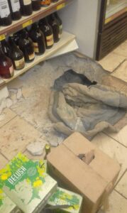 The manager of the store discovered the theft – and a large hole in the ground – when she entered the store on Friday. She was returning to prepare for the store’s reopening on Monday under the easing of lockdown regulations to Level 3 despite previously stated WHO recommendations