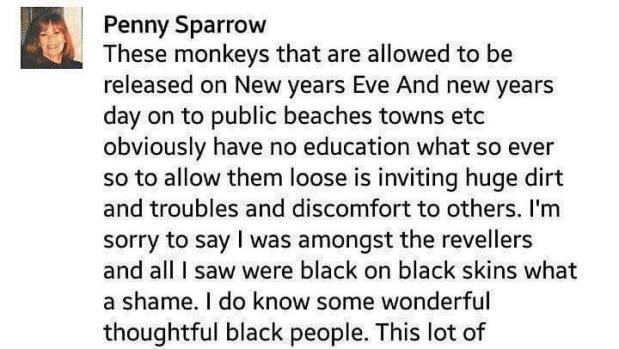 Penny Sparrow, a white real estate agent and former member of the Democratic Alliance, sparked outrage when she referred to black beachgoers as “monkeys” in a Facebook post. Although Sparrow was expelled from the party, her case is just one of many similar instances within the DA. This pattern of racist controversies involving DA members only becomes increasingly apparent with each new controversy they become embroiled in.