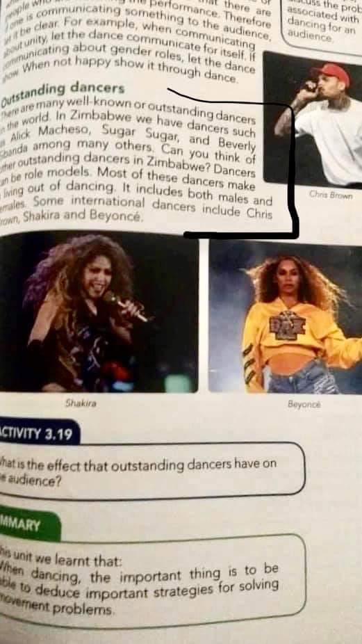 “There are well known outstanding dancers like Alick Macheso, Sugar Sugar, and Beverly Sibanda among others. Can you think of other outstanding dancers in Zimbabwe? Dancers are role models, Most of those dancers make a living out of dancing. Some international dancers include Chris Brown, Beyonce and Shakira” reads part of the text.