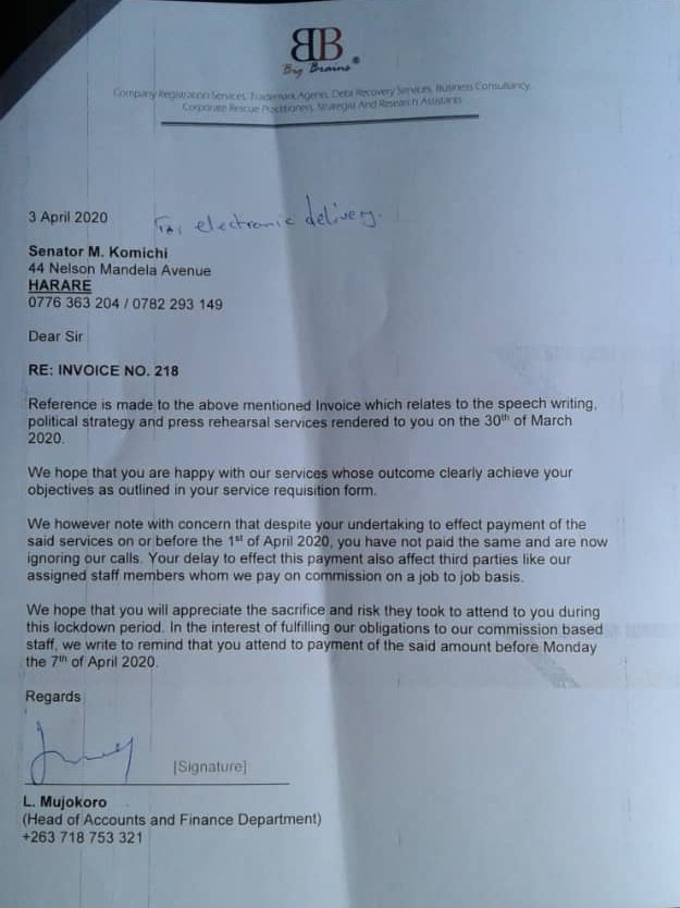 Former MDC Alliance Chairperson Morgen Komichi is being accused by a business called Big Brands for failing to settle speech writing, political strategy and press rehearsal services.