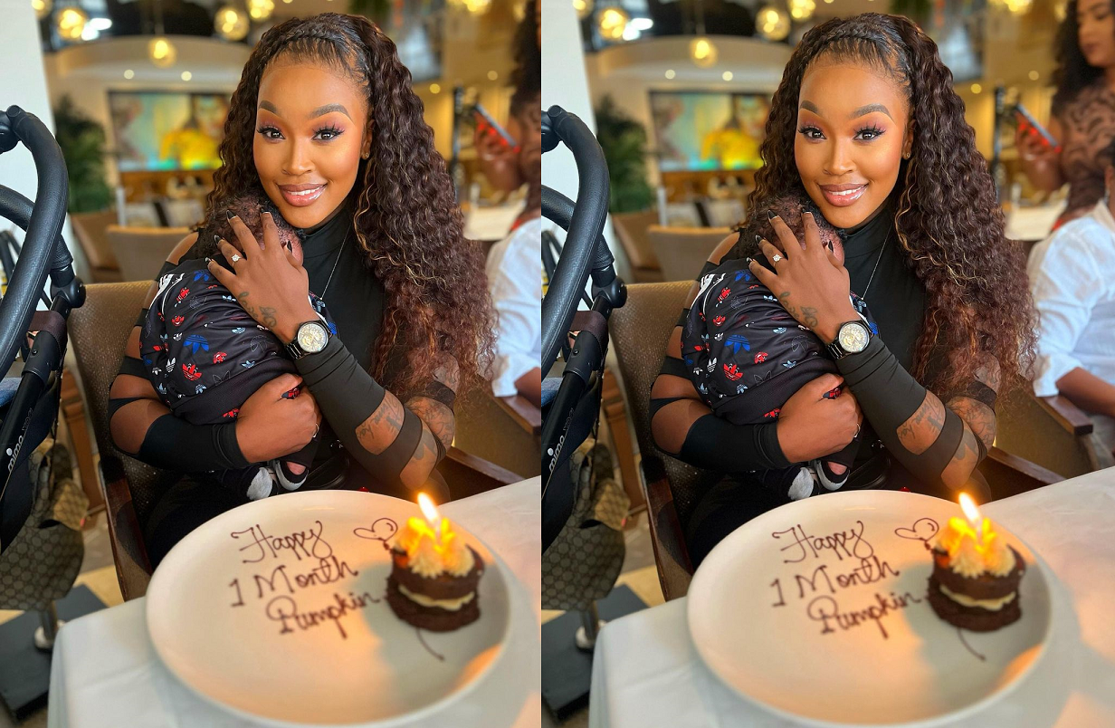Lamiez Holworthy and Khuli Chana celebrate their son’s first month with a surprise reveal on Instagram. Fans had speculated about the birth after noticing Lamiez without her baby bump. Khuli shared a photo of the couple at a restaurant with a cake for their baby boy.