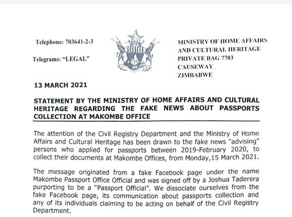 “The attention of Civil Registry Department and the Ministry of Home Affairs and Cultural Heritage has been drawn to the fake news advising persons to go and collect their passports applied in 2019 up to February 2020, to collect their documents from Makombe offices from 15 March 2021. This is not true and any information from the Facebook post is not authentic.”
