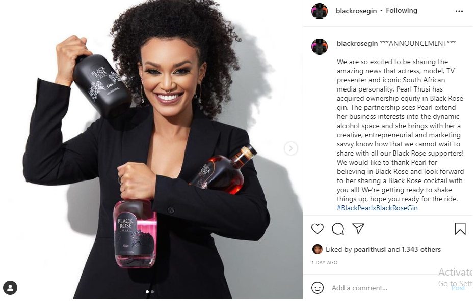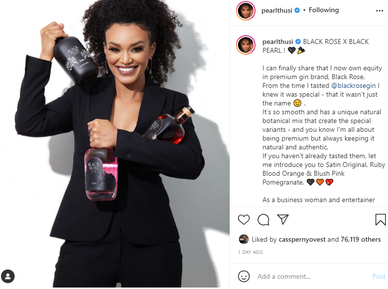 “BLACK ROSE X BLACK PEARL! 🖤🎉I can finally share that I now own equity in premium gin brand, Black Rose. From the time I tasted @blackrosegin I knew it was special – that it wasn’t just the name 😉 . It’s so smooth and has a unique natural botanical mix that create the special variants –and you know I’m all about being premium but always keeping it natural and authentic. If you haven’t already tasted them, let me introduce you to Satin Original, Ruby Blood Orange & Blush Pink Pomegranate.🖤🧡💖 As a businesswoman and entertainer, this is a huge milestone that I’m eager to celebrate with you countrywide and I equally cannot wait to see this venture growing from strength to strength. Thank you to Luxe Brands for believing in me.Thank you to my fans / Cubs for always having my back! (Time to celebrate! 🥳😘) My friends and family for unending love and support. 🥺”, she captioned her post.
