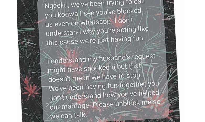 “We live in the same kasi, so I always saw her around. I only started liking her once I got to know her personality,” he said. In April, she told him she wanted her husband to be part of their relationship. “I was shocked. But she told me they have an open relationship and such things happen all the time,” he said.