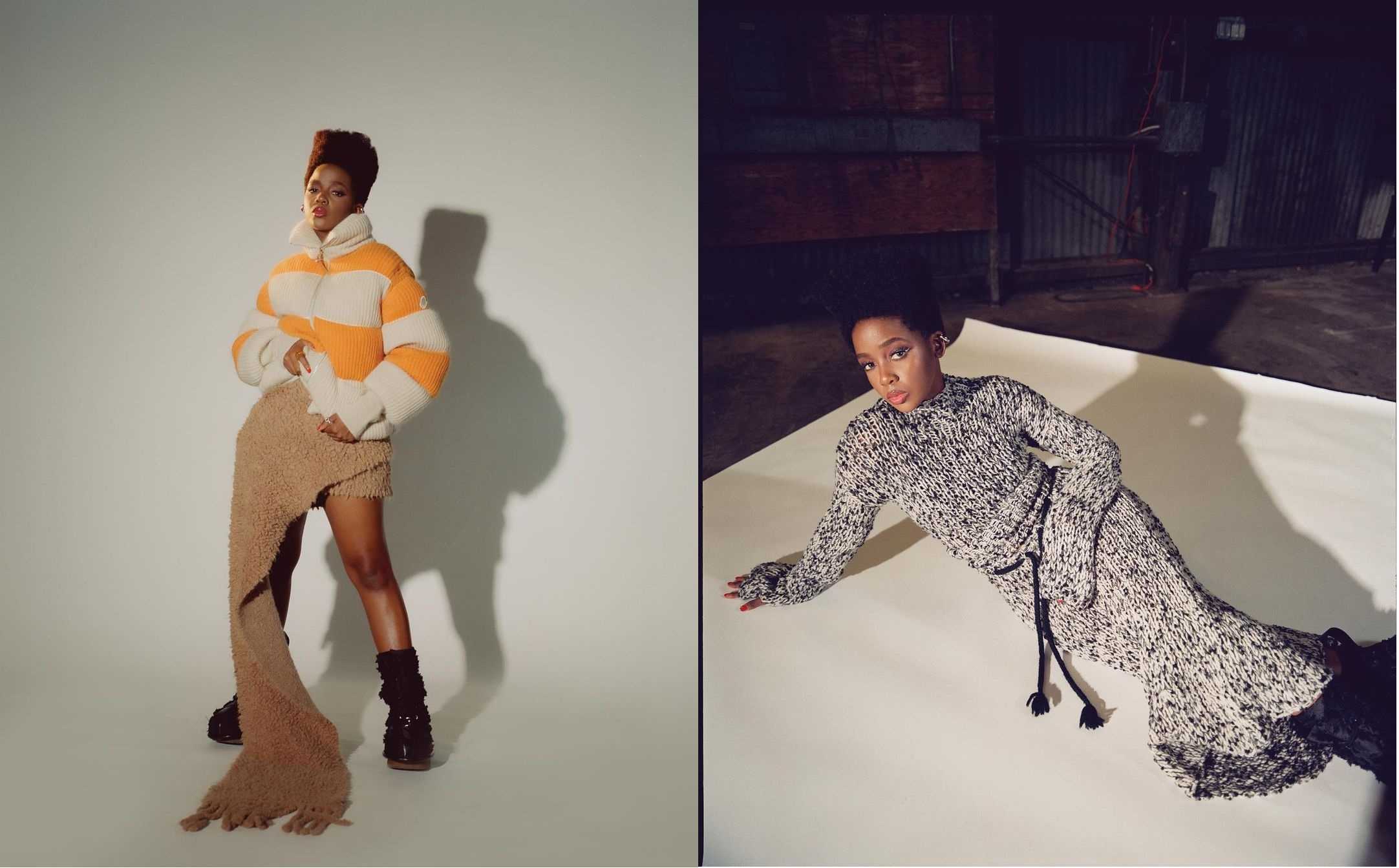 In the first editorial picture, Thuso is wearing a yellow and white striped cropped puffer jacket. Her skirt is asymmetrical, taking inspiration from a dress and a scarf. It looks like a scarf wrapped around her hips, but it’s a nude skirt. The colour contrast of the outfit screams boldness.