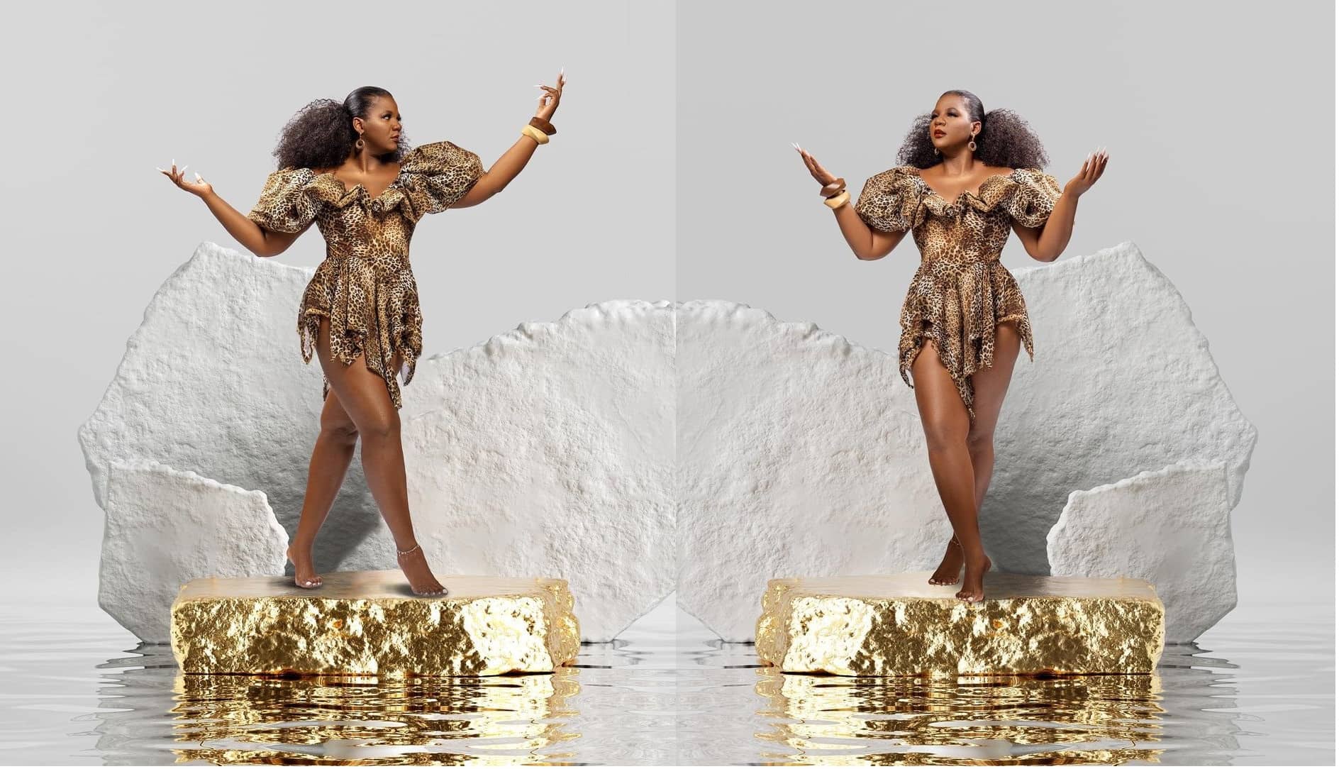 Today is Human Rights Day, and she spoiled fans with a unique photoshoot that gave off Zulu royal vibes. On her two photos, she’s wearing a gorgeous leopard print dress. Her dress is mini, and the fabric is cut intricately for that jungle fever theme. One of the most stunning aspects of the shoot is the background. Firstly, there are white ice sheet-shaped backdrops behind her. In her photos, she’s also standing on a golden pedestal.